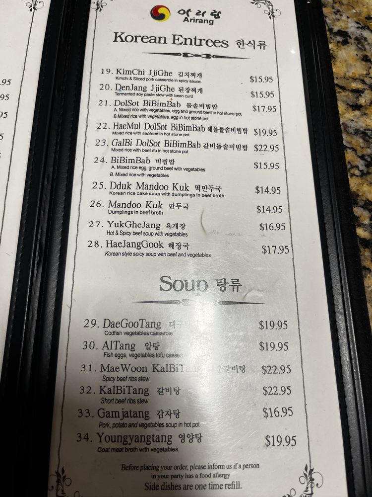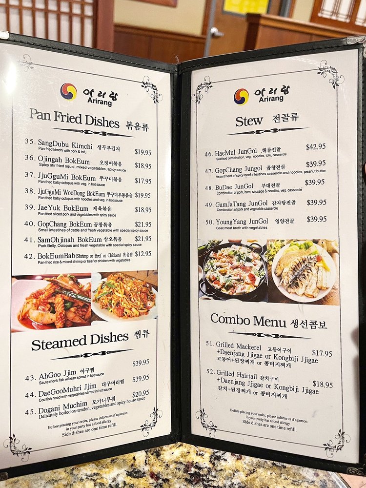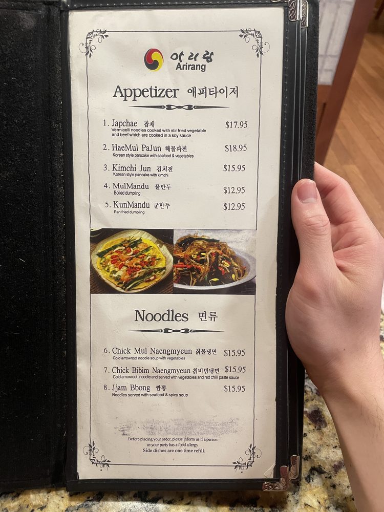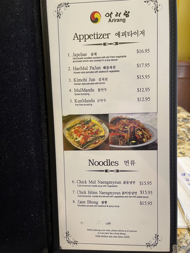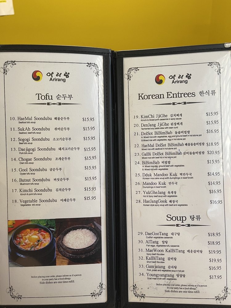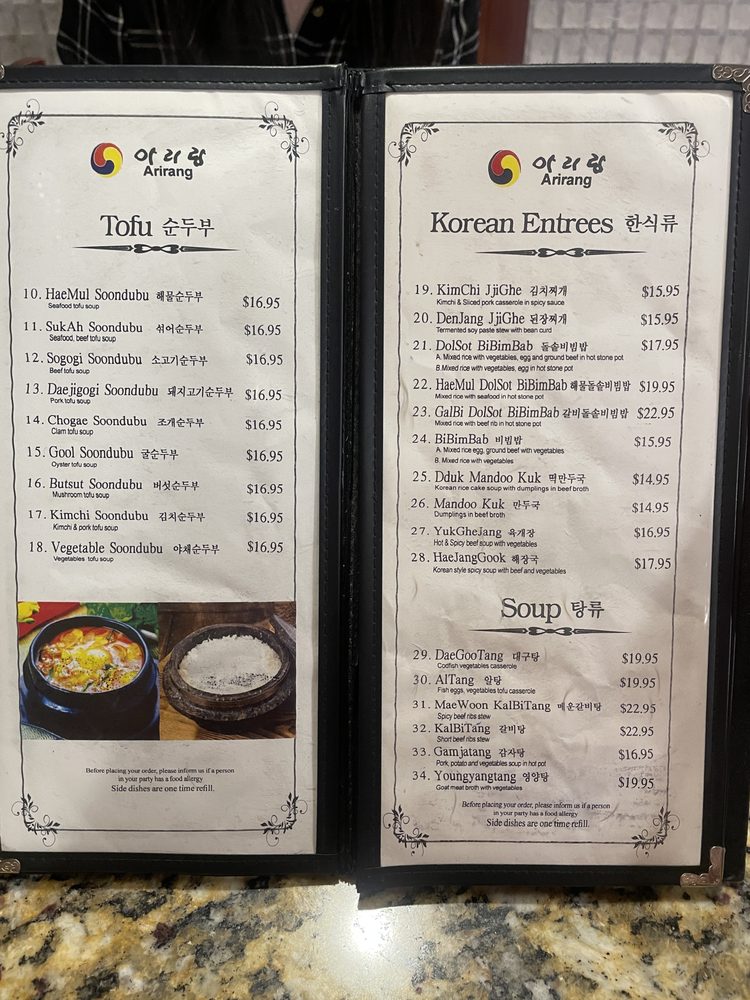 Arirang, a hidden gem in Rockville, MD, offers a peaceful ambiance and top-notch service. The extensive menu includes dishes like Japchae, Kimchi Jun, Naengmyeun, Kimchi Jjighe, and Dolsot Bibimbab. Customers praise the solid food quality, generous portion sizes, and flavorful banchan side dishes. The Seafood Pancake and Seafood Tofu Soup stand out for their rich flavors and perfectly balanced textures. The Bibimbap impresses with its colorful presentation and harmonious blend of savory beef and fresh vegetables. The attentive wait staff and serene interior add to the overall dining experience. Arirang ensures a memorable journey for both Korean cuisine enthusiasts and newcomers seeking authentic flavors. It's a must-visit spot for anyone craving a satisfying and immersive dining experience.